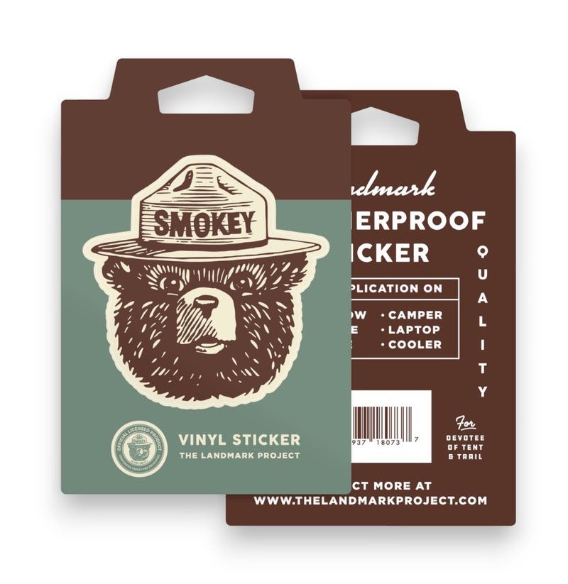 Smokey Bear Sticker. Catalog your adventures with stickers of your favorite national parks! Our original artwork looks great on water bottles, car windows, coolers, or wherever else they may be applied. Each sticker is screen printed on weatherproof vinyl -- durable enough to stand up to the elements while still looking good for years. When peeled away from the backing, the sticker measures 2.5” x 3”.