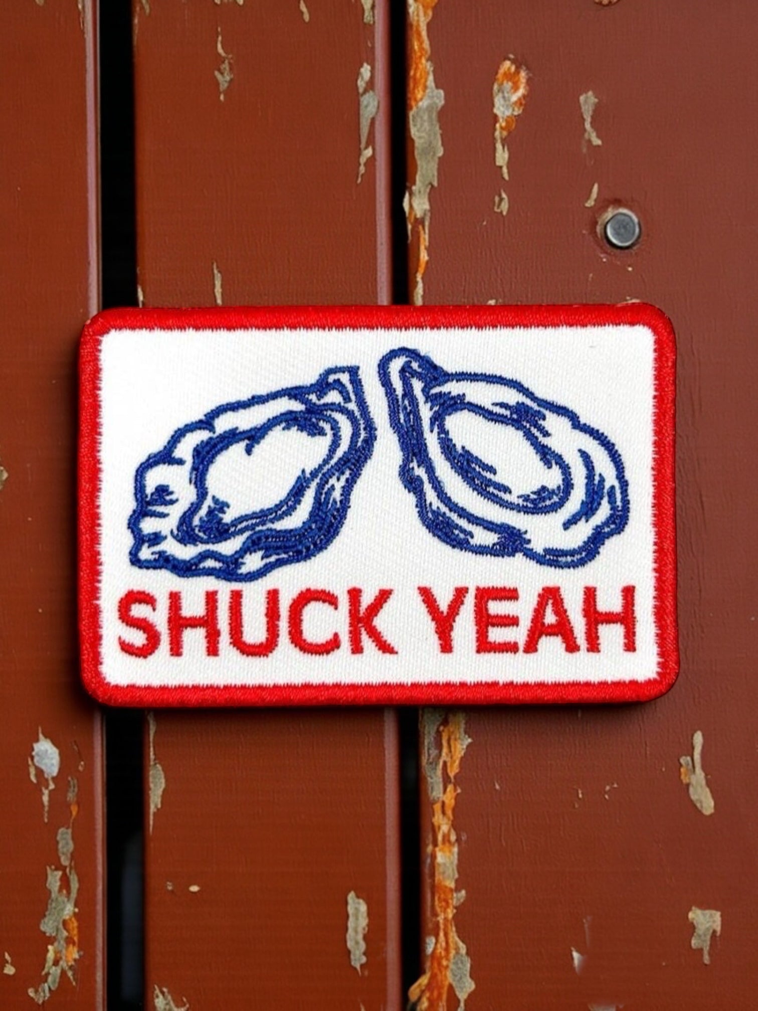 Patch Details: Size: 1.75 x 2.75 inches Colors: Red, White and Blue Vibrant and eye-catching with clear, fun lettering and oyster graphic Material: High-quality embroidered fabric Application: Iron-on backing for quick and secure attachment Design: "Shuck Yeah" text with an oyster graphic