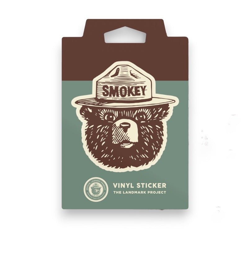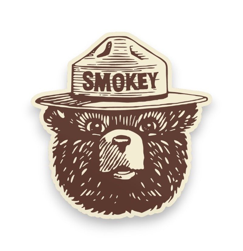 Smokey Bear Sticker. Catalog your adventures with stickers of your favorite national parks! Our original artwork looks great on water bottles, car windows, coolers, or wherever else they may be applied. Each sticker is screen printed on weatherproof vinyl -- durable enough to stand up to the elements while still looking good for years. When peeled away from the backing, the sticker measures 2.5” x 3”.